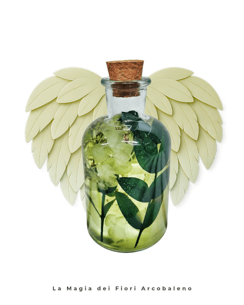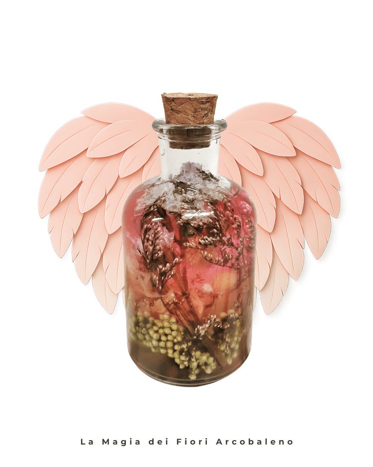 Ogni bottiglietta racchiude fiori secchi, acqua, glicerina e 7 gocce della miscela “Angelsword” (Australian Bush Flower Essences)..